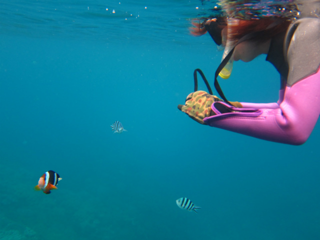 海の中はスゴク綺麗で魚もいっぱいいて、魚と一緒に泳げたのが感動でした。