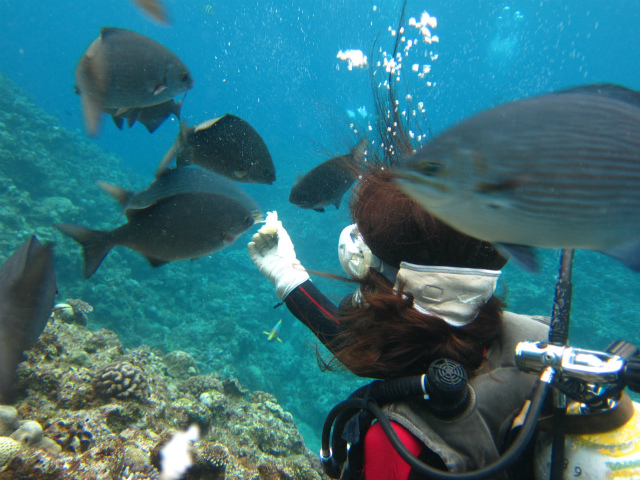 少し曇っていましたが、透明度もとても良く、熱帯魚達もたくさん寄ってきてくれましたよ~