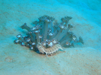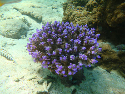 で、透明度も上等! レイシガイダマシにやられたサンゴ発見