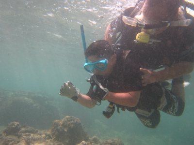 タンクはまだ持てないので、大本さんのレギュレーターを吸いながら。