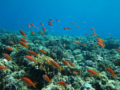 浅瀬ではキンギョハナダイのオレンジ色の体と、海の青色とのコントラストがとっても綺麗でした
