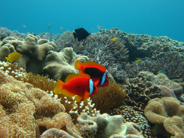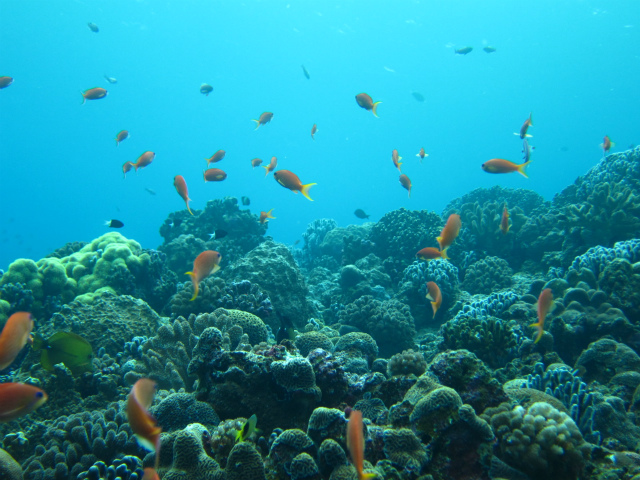 ハードコーラルにハナゴイや、キンギョハナダイが群れ、とっても綺麗