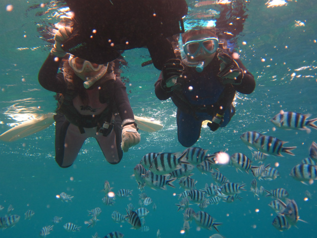姉弟仲良く、魚に餌付けをしたり、泳いだり