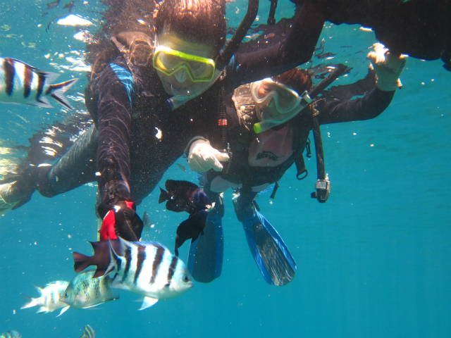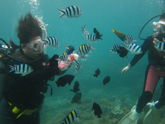 餌付けでは、ロクセンスズメダイや、ヤマブキベラがとっても近くに