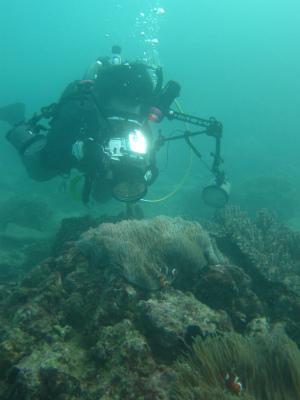 カクレクマノミでワイドマクロを練習中の旦那さん