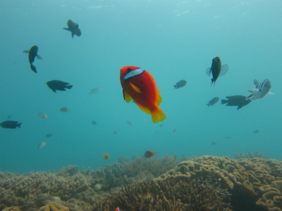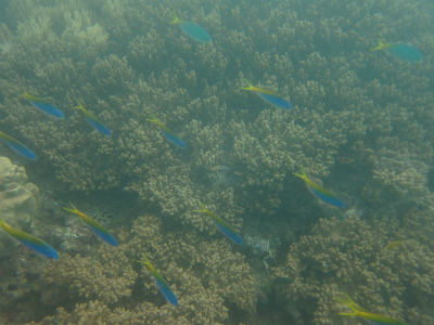 ロクセンスズメダイや、ヤマブキベラ、カクレクマノミなど、沖縄のカラフルな魚達と綺麗な海を堪能していました