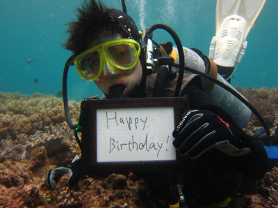 誕生日の記念写真も水中で