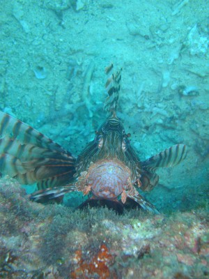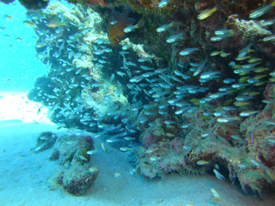 さて、ポイントは座間味の當間(×2本)と、渡嘉敷のアリガー。當間の1本目は、ドラゴンレディと呼ばれる飛行機が沈んでいる所だったのですが、何度もご覧になっているお客様だったので、ご本人の意見を尊重し、周辺散策となりました。コンパスを頼りにあっちウロウロ、こっちウロウロ。行けども行けども、砂と岩とサンゴが少々。魚影も少ないし、正直さっぱり。