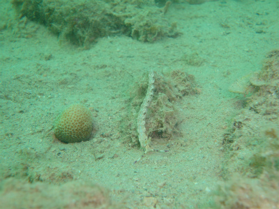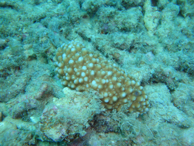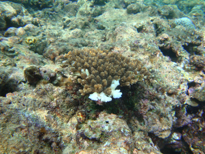 で、透明度も上等! レイシガイダマシにやられたサンゴ発見