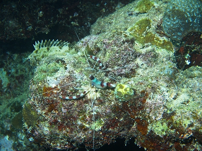 さて、夜闇に包み込まれた海中を、ライトの光を頼りに被写体を探す我々。次に目に留まったのが、立派なオトヒメエビ。日中は岩穴などに隠れている彼らも、夜になるとエサを求めて活発に動き回ります。そのすぐそばには、エーグァー(アイゴ)が寝ていたのですが、オトヒメエビの写真を何枚か撮影しているうちに目を覚ましてしまいました。驚いて逃げ出そうとするものの、まだ体がうまく動かせず、岩の上からズリ落ちていくエーグァー。悪いとは思いながらも、その姿に爆笑してしまいました。