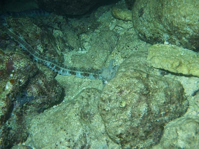 昼間の海とは違い、不思議な静寂が支配している夜の海。そんな中で、一際活動的になるのが棘皮動物たち。様々な種類のウニ、ヒトデ、ナマコたちが、岩の上や海底を闊歩しています。そして、これまた一際異彩を放つのがオオイカリナマコ。全長3mにも達する細長い体を持ち、ナマコのイメージを覆す程の速さで海底を移動する彼ら。カメラを構えている間にも、水中ライトを嫌って岩伝いに逃げていくオオイカリナマコ。一箇所にジッと留まってはくれません。何とかピントを合わせて撮影することが出来ました。